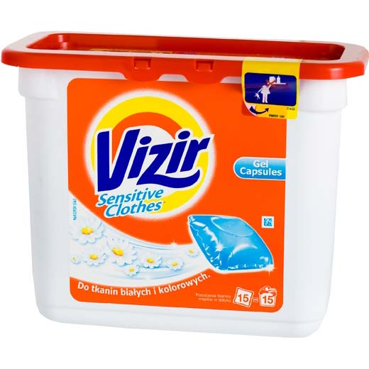 Vizir Sensitive Clothes kapsułki do prania. Skutecznie piorą już w niskich temperaturach, dzięki unikalnej formie kapsułek łatwo się dozują i całkowicie rozpuszczają, polecane do prania tkanin białych i kolorowych. Opakowanie 15 sztuk.